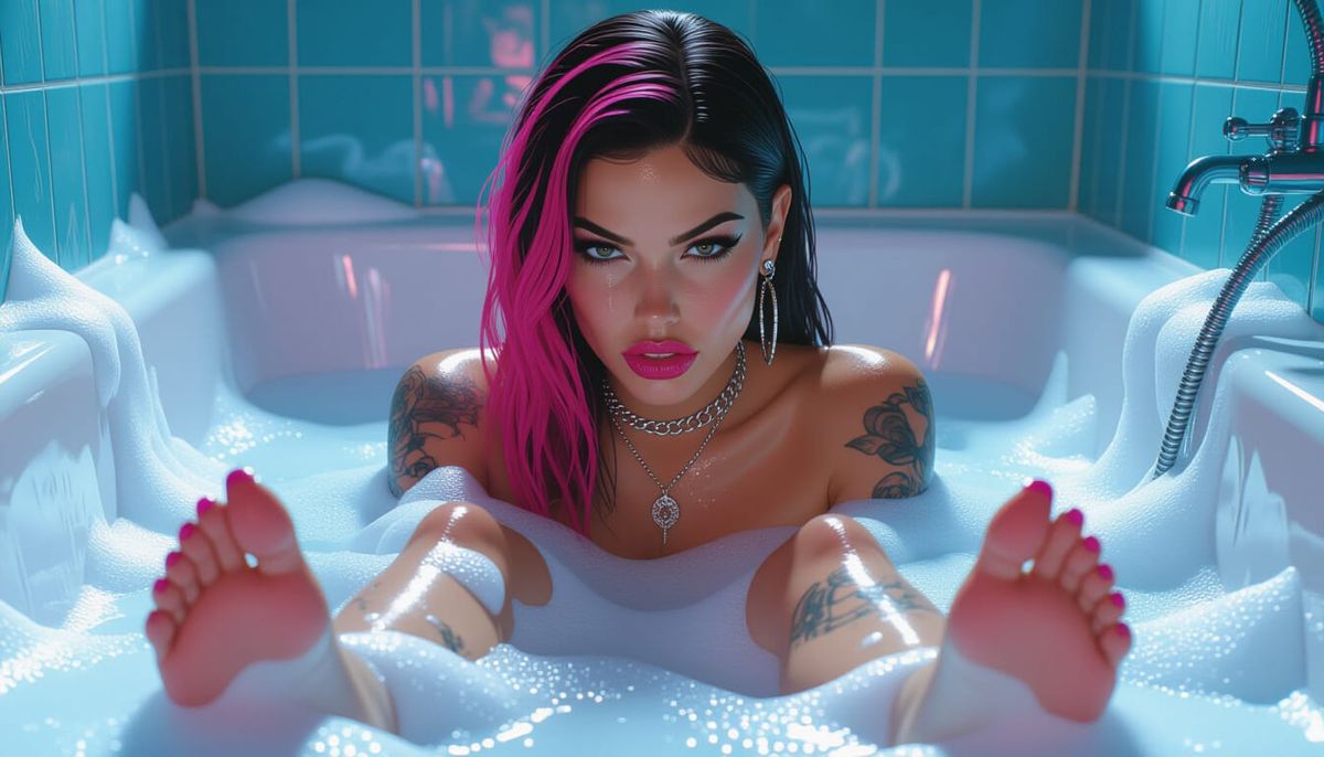 This image shows a tattooed brunette woman with bright pink highlights, posed in a bathtub covered in soapsuds. The hyperrealistic CG art features vibrant neon colors and dramatic lighting.