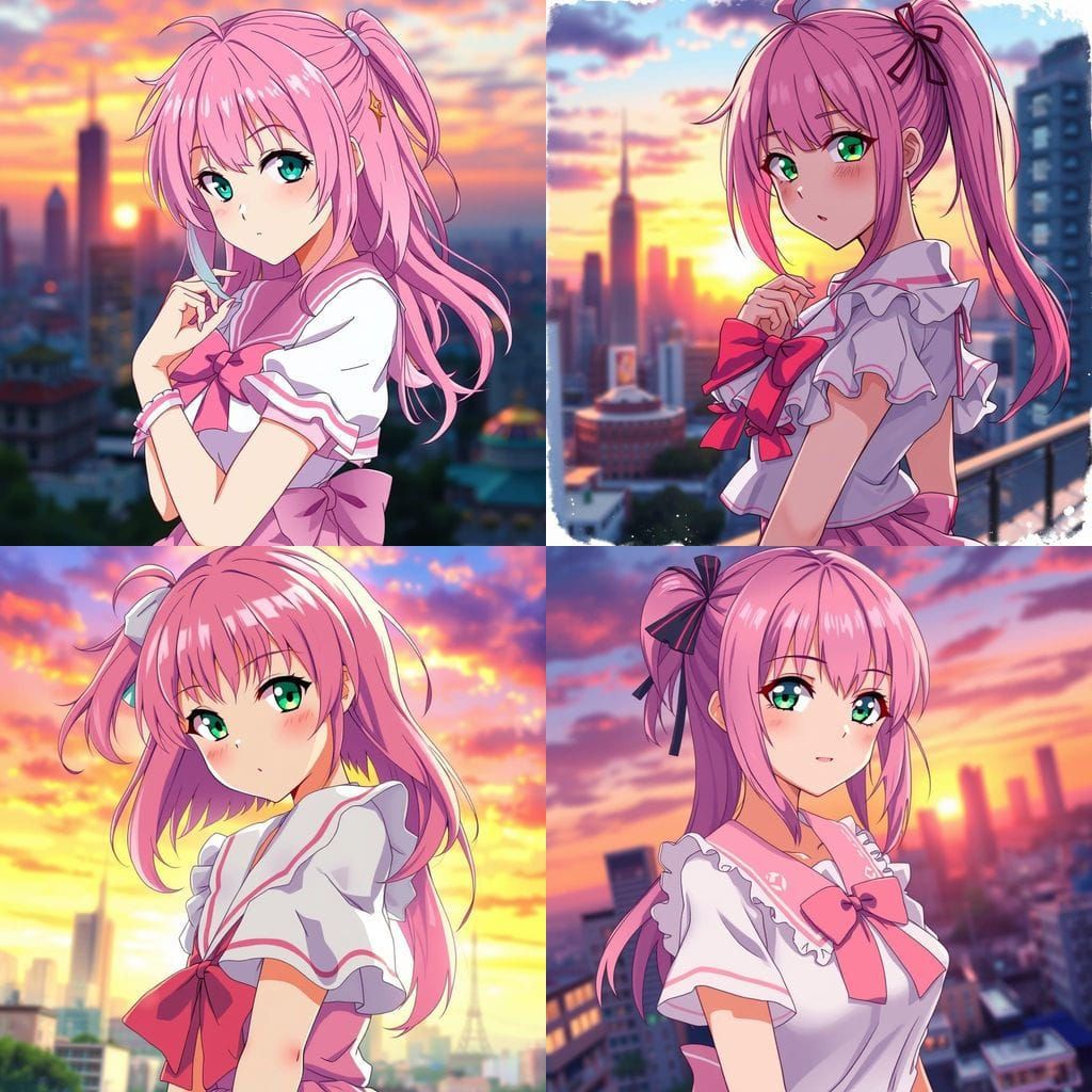 This image captures a whimsical anime girl with pastel pink hair and emerald eyes, posing in a frilly school uniform, set against a dreamy cityscape at sunset, blending Kaname Jun's delicate lines with vibrant colors reminiscent of watercolor art.
