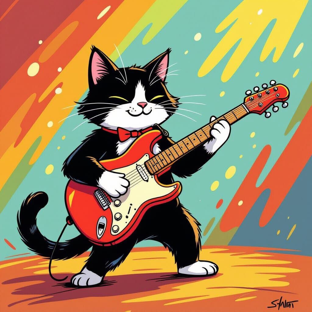 This image shows an adult black and white cat energetically playing a guitar. Rendered in a vibrant, illustrative style with bold outlines and dynamic poses, it features bright, contrasting colors and energetic brushstrokes.
