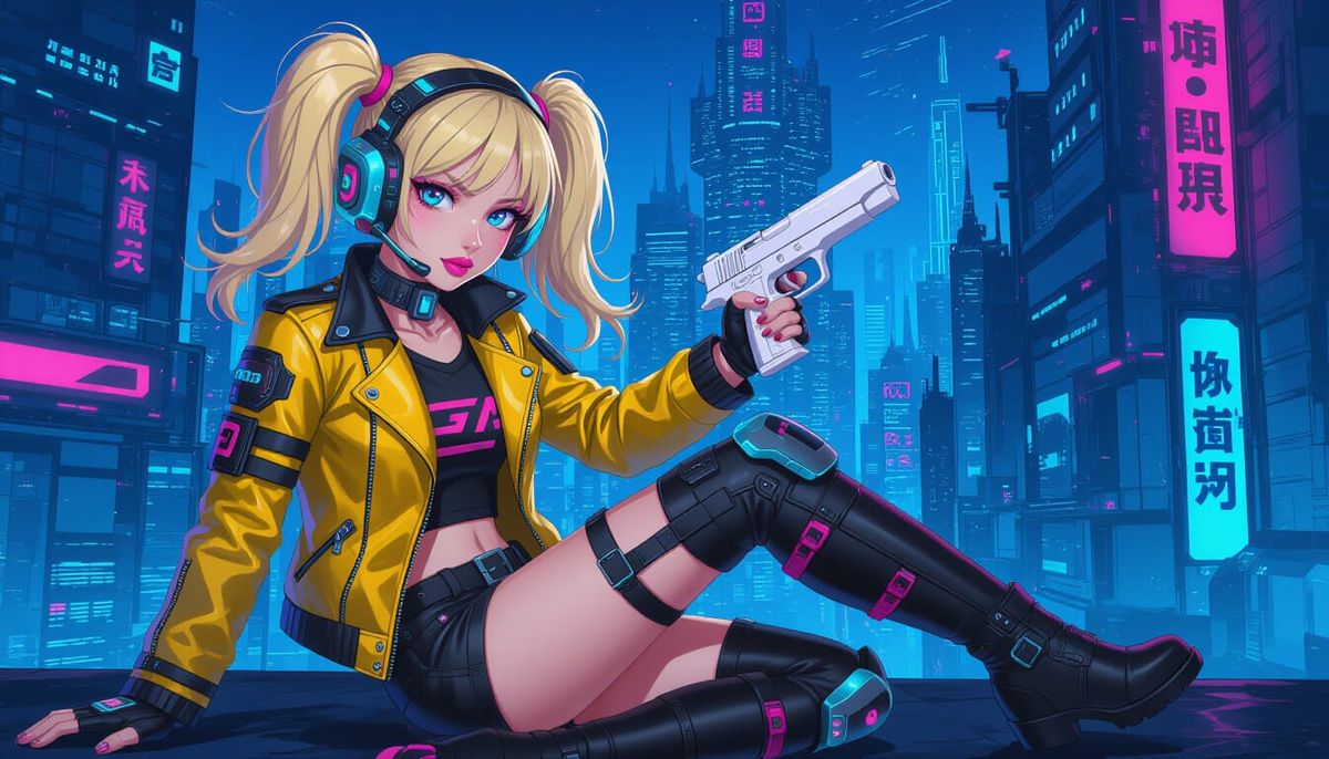 A semi-anime style image of a teen girl with blonde pigtails, holding a pistol in a vibrant cyberpunk city. Features dynamic lighting and a widescreen aspect ratio.