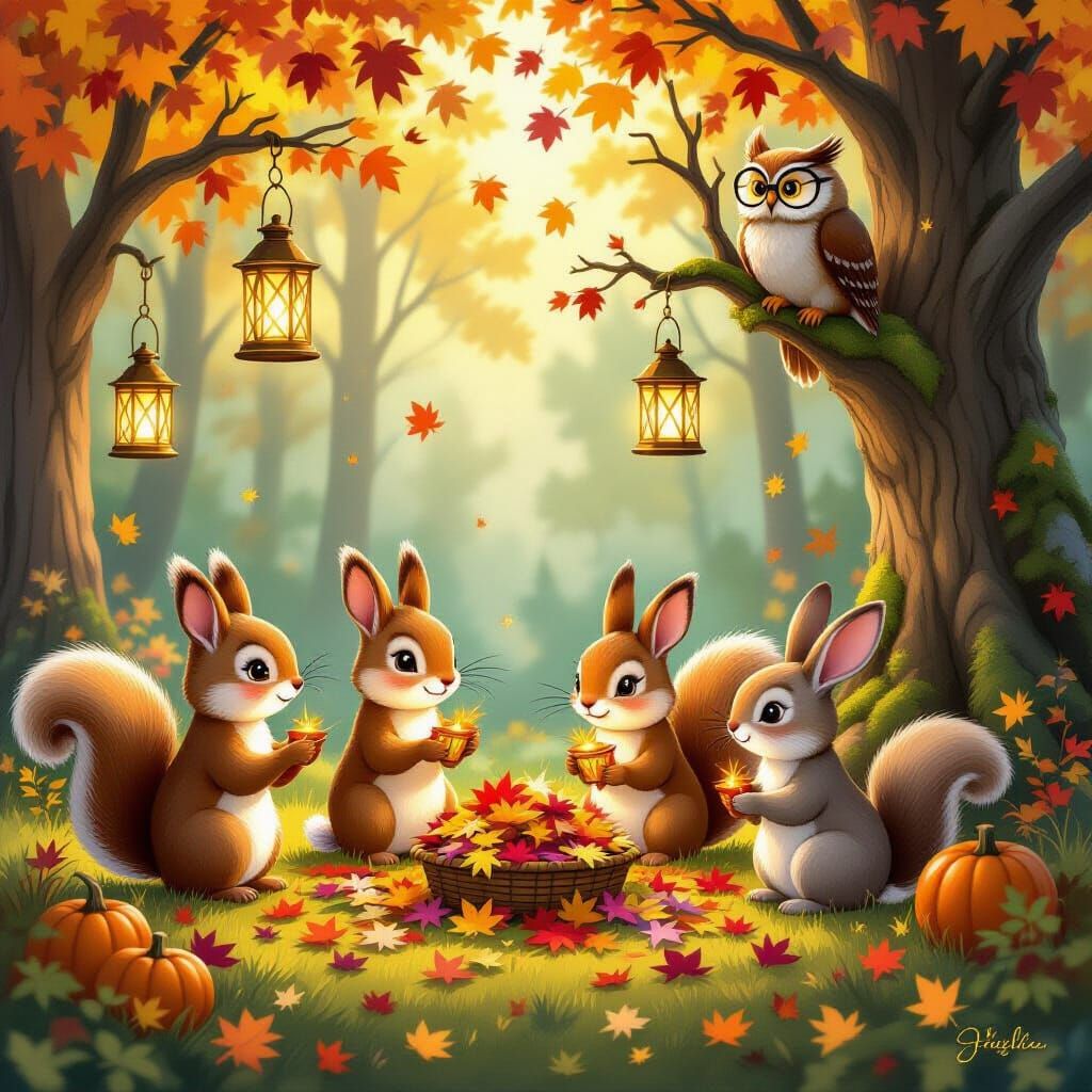 A charming storybook illustration of woodland animals setting up for a vibrant autumn festival in a cozy forest. Golden hour light illuminates the scene with a warm glow.
