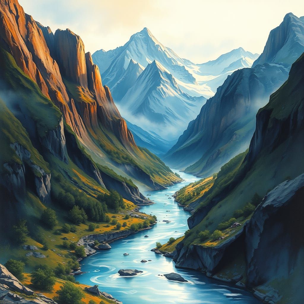 Create your own detailed matte paintings of mountain landscapes and rivers with our free AI image generator.