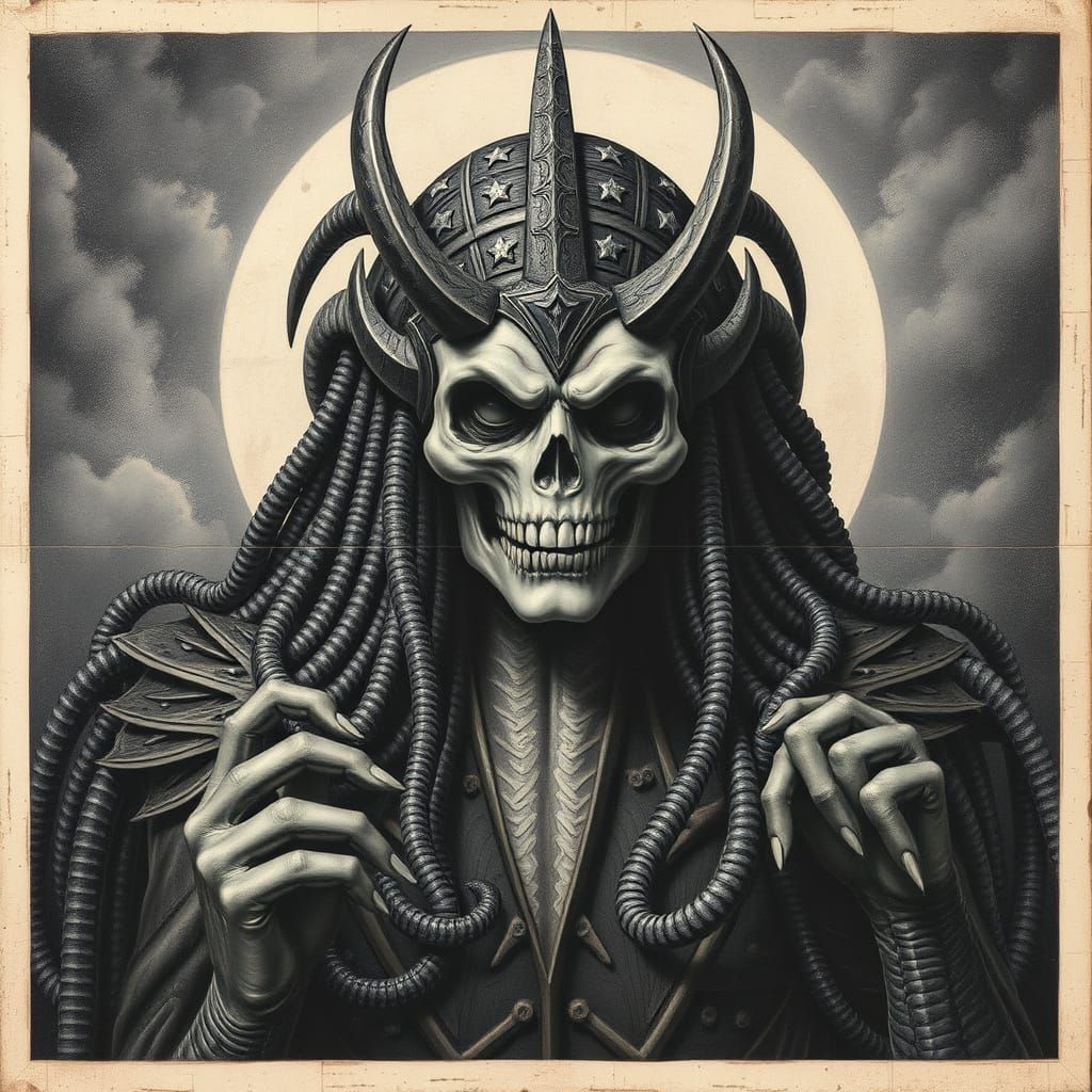 This image is a dark, industrial interpretation of the classic beauty pageant, with twisted, biomechanical elements. Inspired by the surrealist works of H.R. Giger, this artwork combines eerie atmosphere with a haunting vision of American culture.
