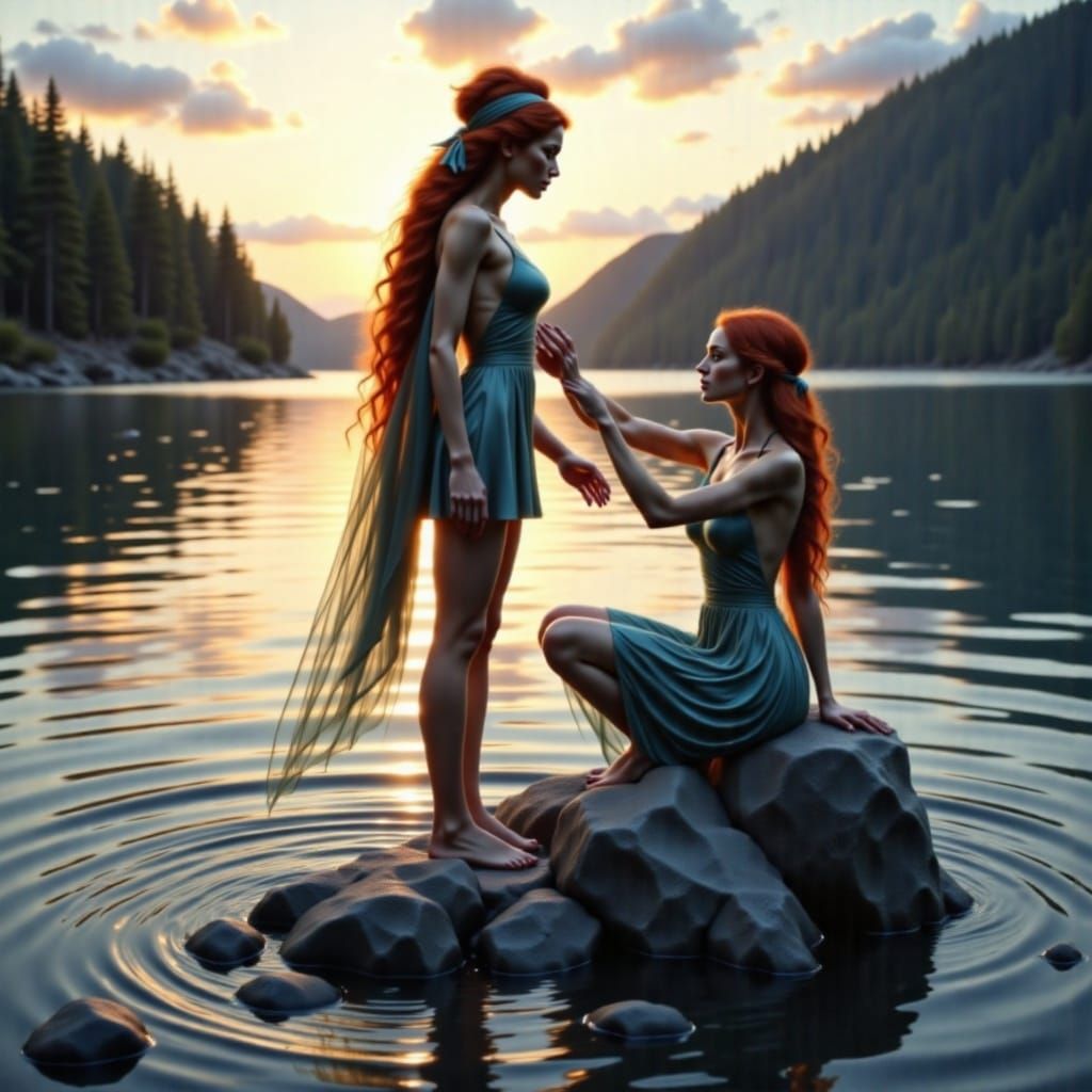 A photorealistic image of Tsarina Evdokija in a scarlet dress and ermine fur, standing on a rock in a clear, frozen lake. Features volumetric light and sharp details.