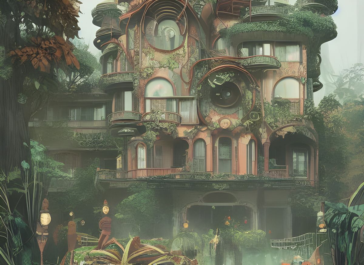 A futuristic mansion villa surrounded by an overgrown garden. This vibrant image features a colorful, intricate, ornate design in a solarpunk aesthetic.