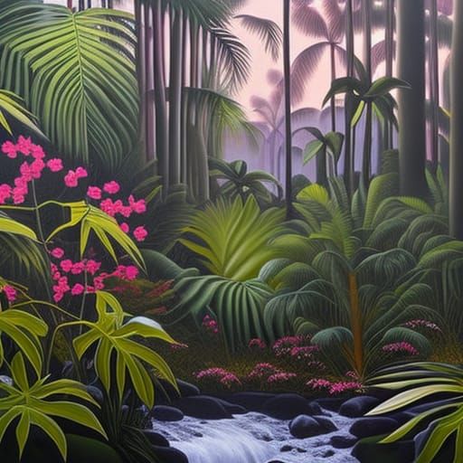 A sinister landscape featuring a dark forest with trees, vines, and colorful orchids. This image evokes a dangerous, fantasy world rendered as an oil painting.