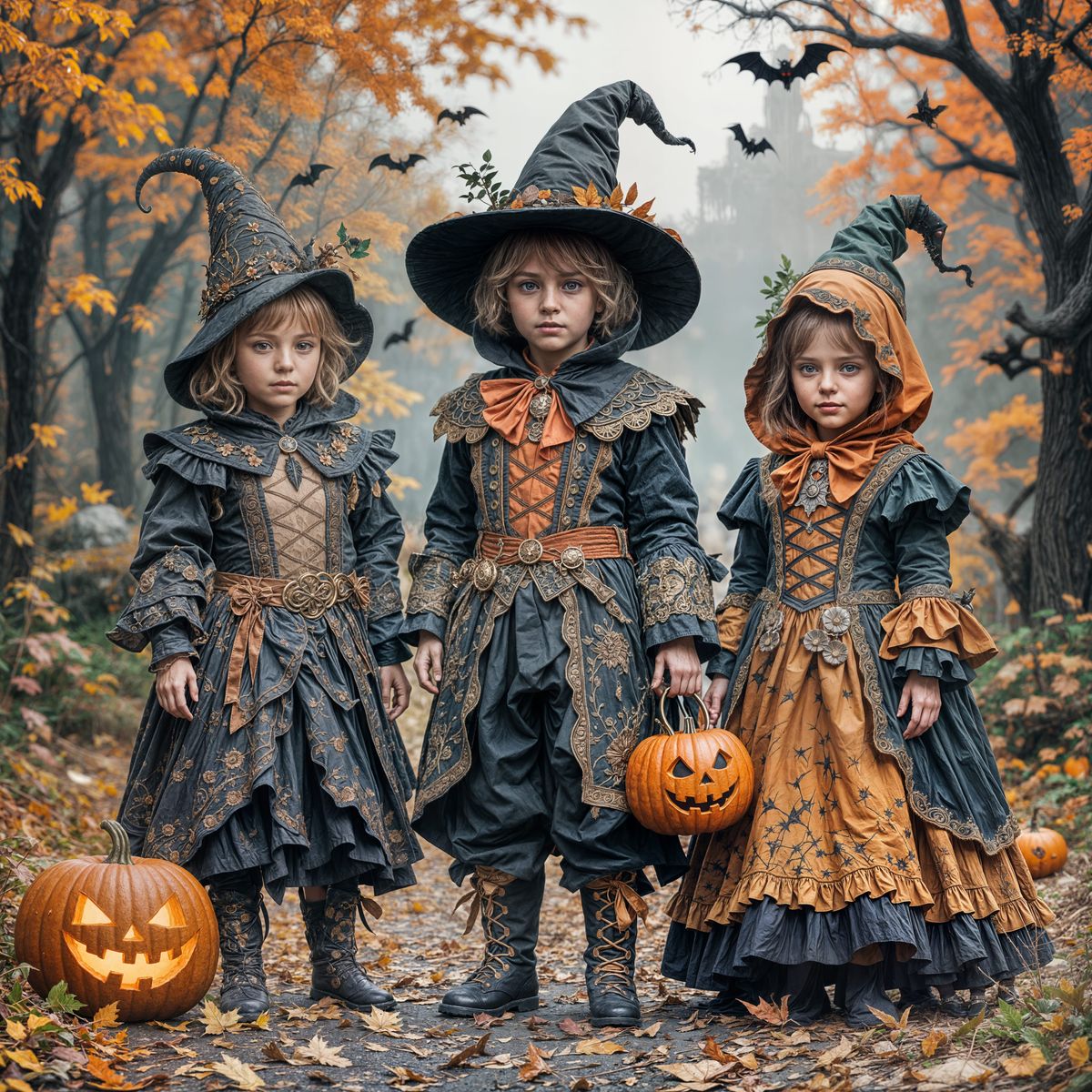 This image shows photorealistic children in Halloween costumes, rendered as a detailed matte painting with deep, complementary colors and intricate fantasy concept art.