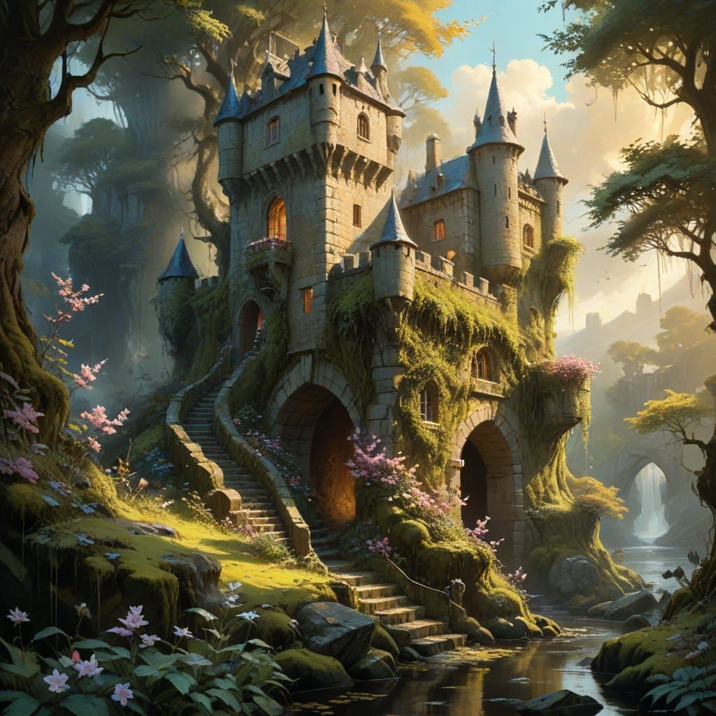 A digital oil painting of a moss-covered castle in an ancient forest. The towers are entwined with ivy and luminous blossoms, bathed in golden light, evoking mystery and folklore.