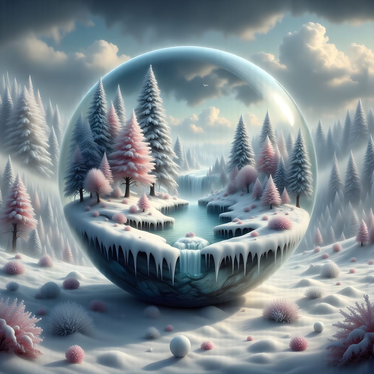 A massive, flawless glass sphere hovers over a barren, snow-covered landscape. Within the orb, a miniature, lush forest creates a surreal contrast, captured with ultra-realistic photography.