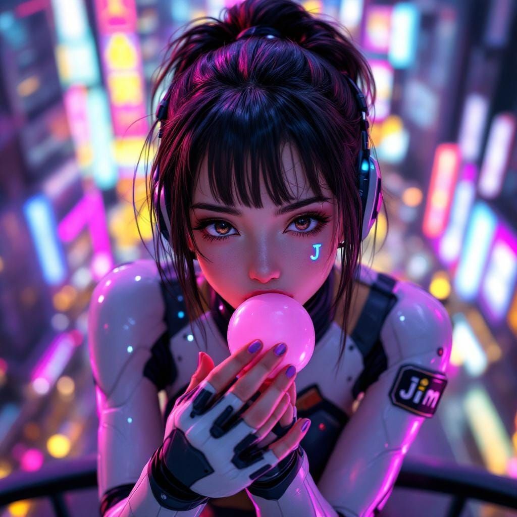 This image shows a young girl in a mech suit, blowing bubble gum. She is striking a victory pose against a vibrant, glowing cityscape. The image is rendered in a futuristic anime style.