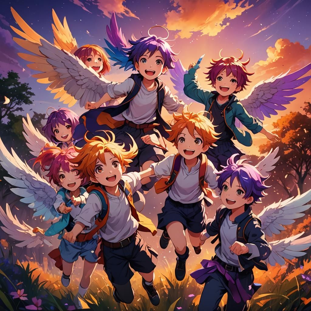 This image shows a happy group of winged children with vibrant hair taking flight. This digital anime-style painting, inspired by Studio Trigger, features soft textures, warm colors, and cinematic lighting.