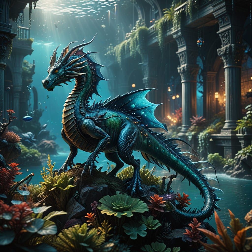 This image depicts a majestic sea dragon in a fantastical underwater realm, surrounded by vibrant cyan and silver hues. The scene is a masterpiece of intricate detail and deep color, showcasing the beauty of a mysterious world beneath the waves.