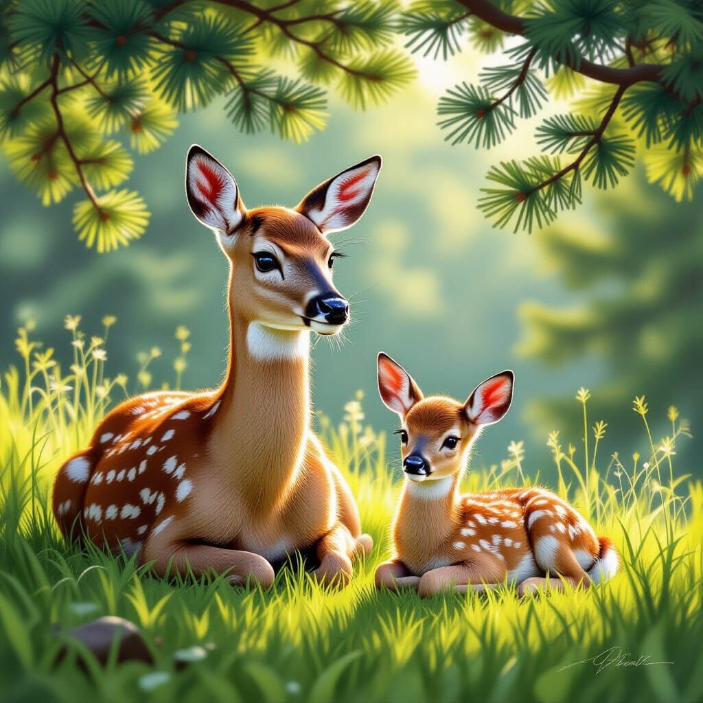 This image shows a mother deer and her fawn resting on grass under spruce trees. The scene is illuminated by atmospheric light, highlighting their bond. Created as a detailed digital matte painting with charcoal drawing elements.