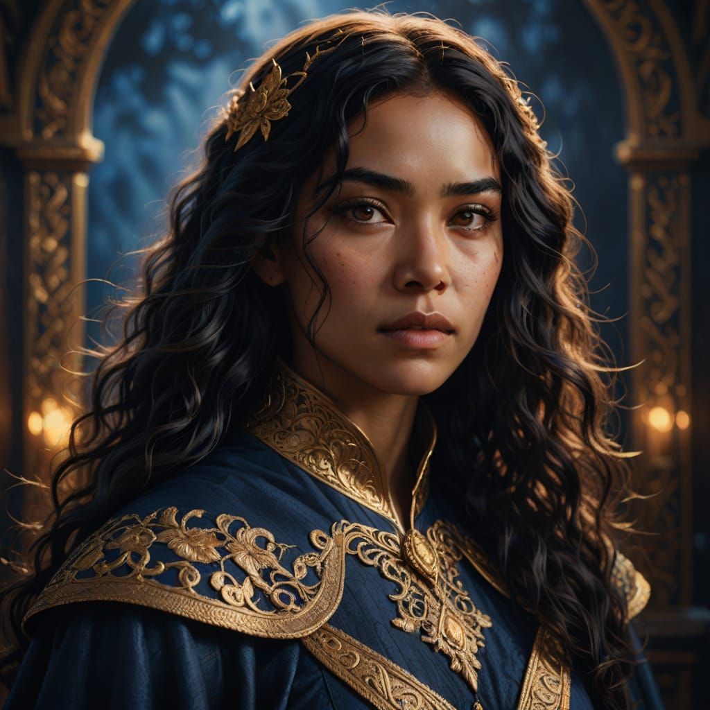 A captivating photorealistic portrait of a young woman with mixed ethnicity, adorned in a dark blue high-collared dress and golden cape, set against a textured blue and gold backdrop, exuding mystery and elegance.