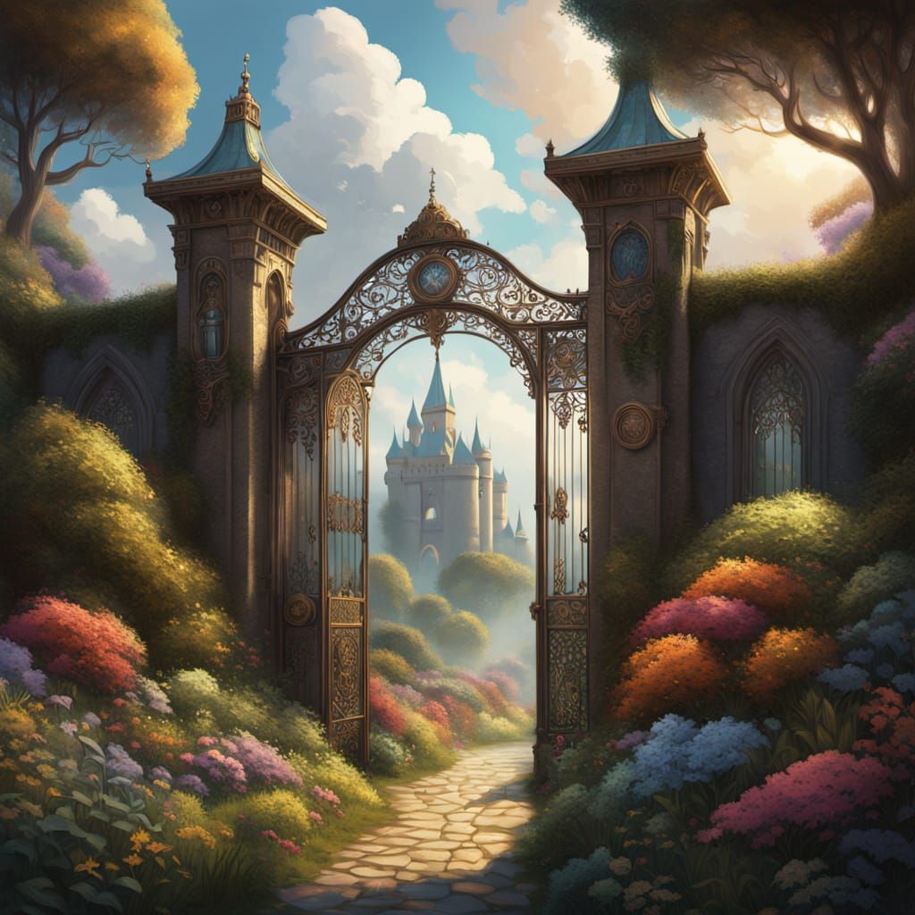 A serene digital painting of a mystical English garden at dusk, with vibrant colors, intricate gate details, and warm golden lighting on misty clouds, set against an epic fantasy landscape