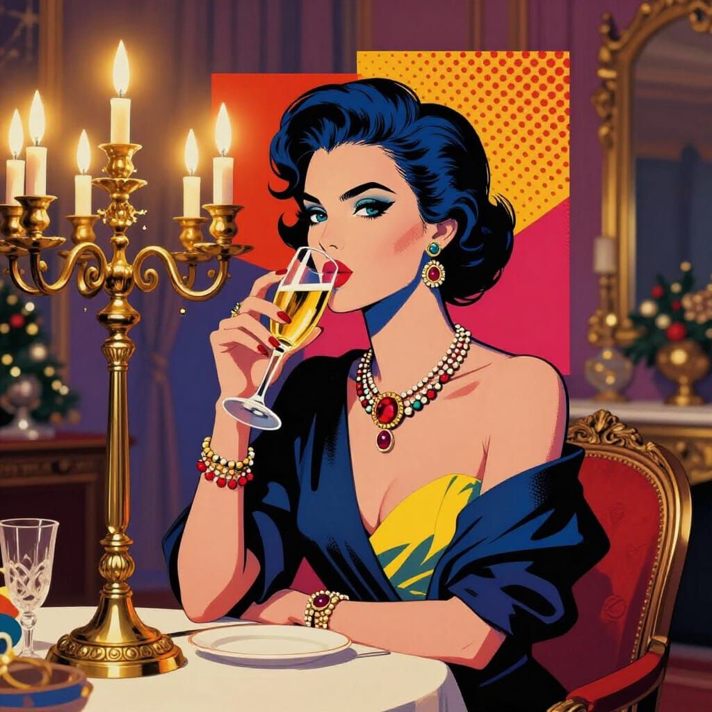 This image features a stylish fashionista enjoying champagne in a richly decorated room, illuminated by a candelabra. Rendered in a vibrant pop art style with bold colors and dramatic lighting.