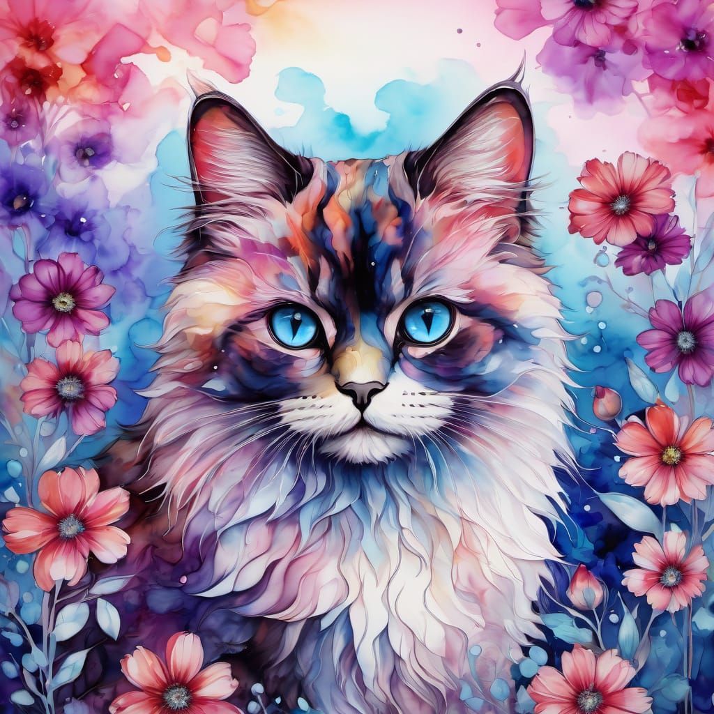 This image shows a fluffy cat with striking blue eyes sitting on a windowsill amidst colorful flowers. The scene is bathed in sunset light, rendered with delicate colors in an alcohol ink style.