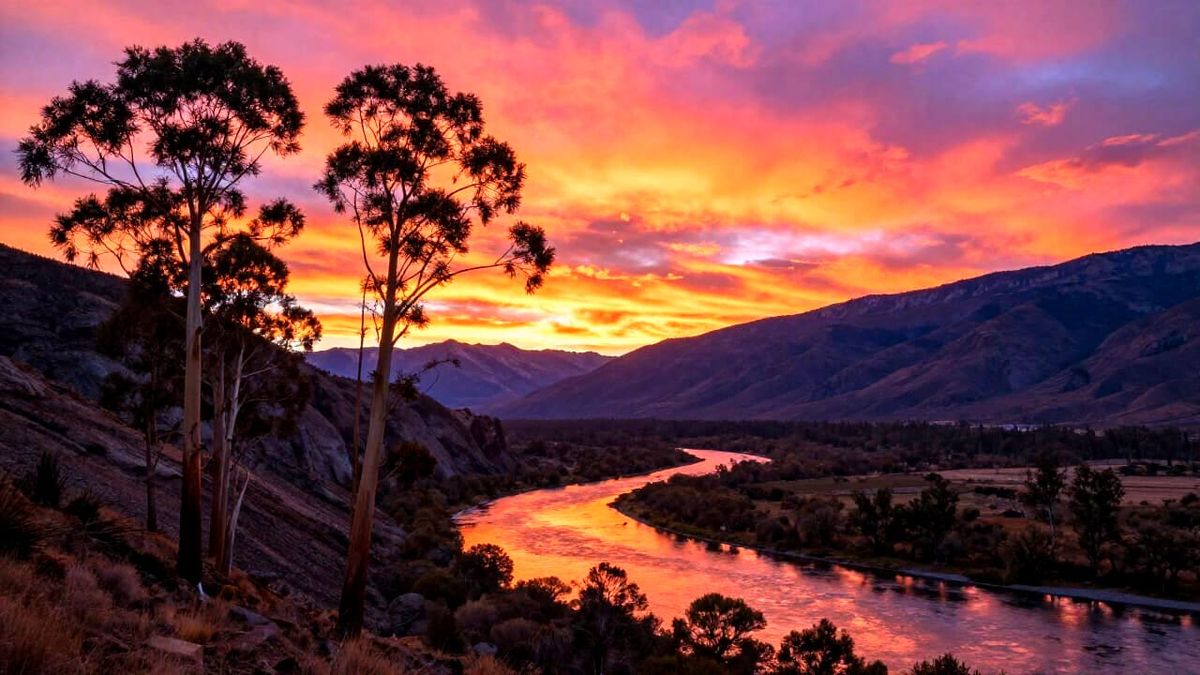 This image captures a stunning mountain sunset with vibrant orange, pink, and purple hues reflecting on a flowing river. Silhouetted eucalyptus trees frame the foreground in a beautiful landscape style.