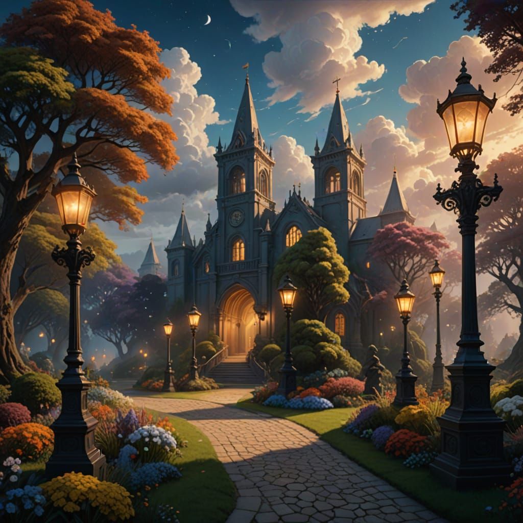 This enchanting image captures a serene moment in a lush English garden under the soft glow of gas lamps and starry night sky, exuding a sense of mystical wonder and gothic charm.