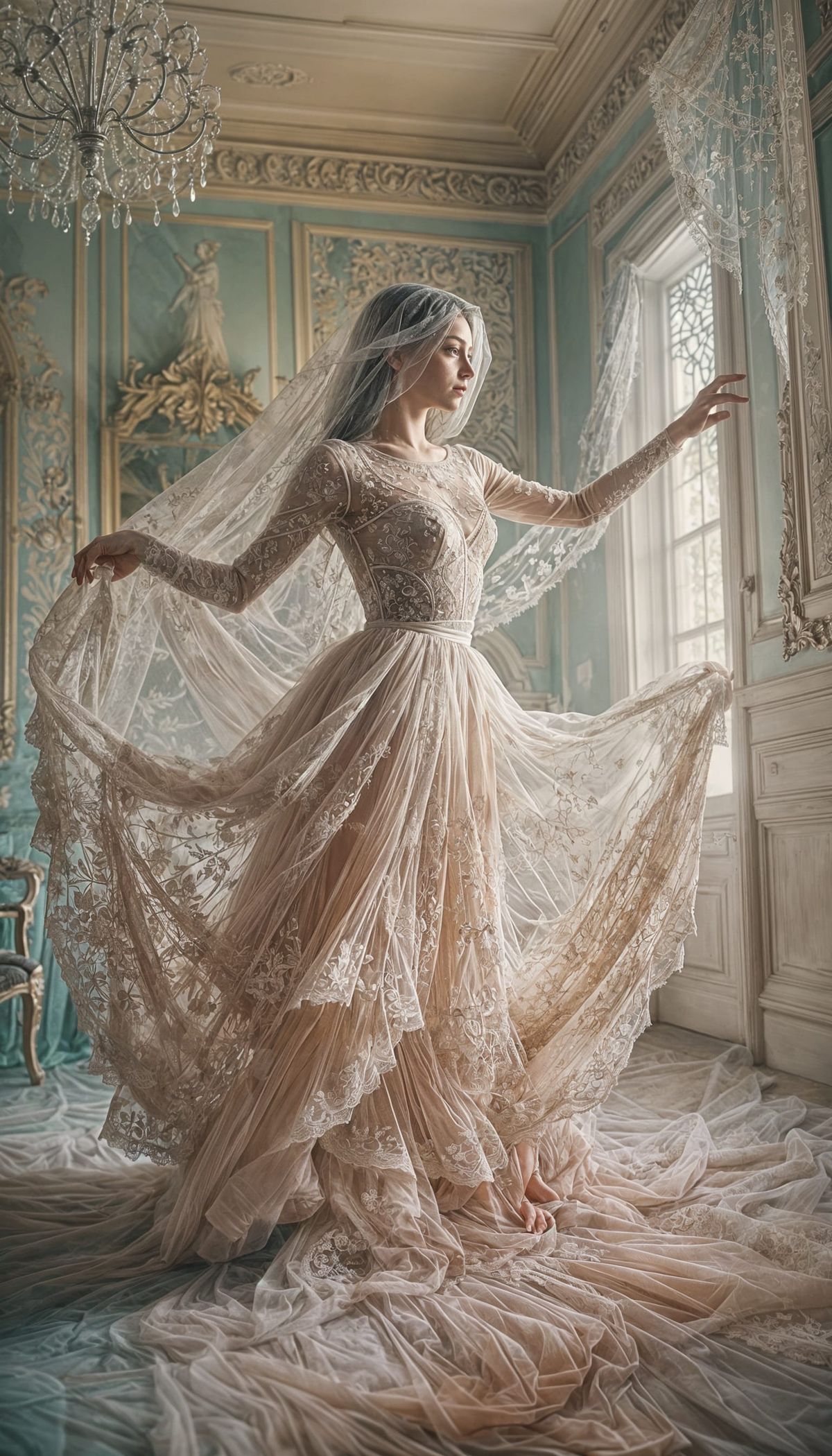 This image shows a woman dancing in a room filled with lace and tulle. Pastel colors and transparencies create an enchanting, fairy-like atmosphere as a double exposure photograph in alcohol ink art.