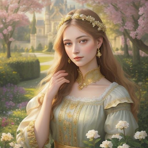 A classical oil painting of a young woman standing in a vibrant garden with a distant castle. The artwork features delicate gold embroidery, soft brushstrokes, and a warm, romantic light.