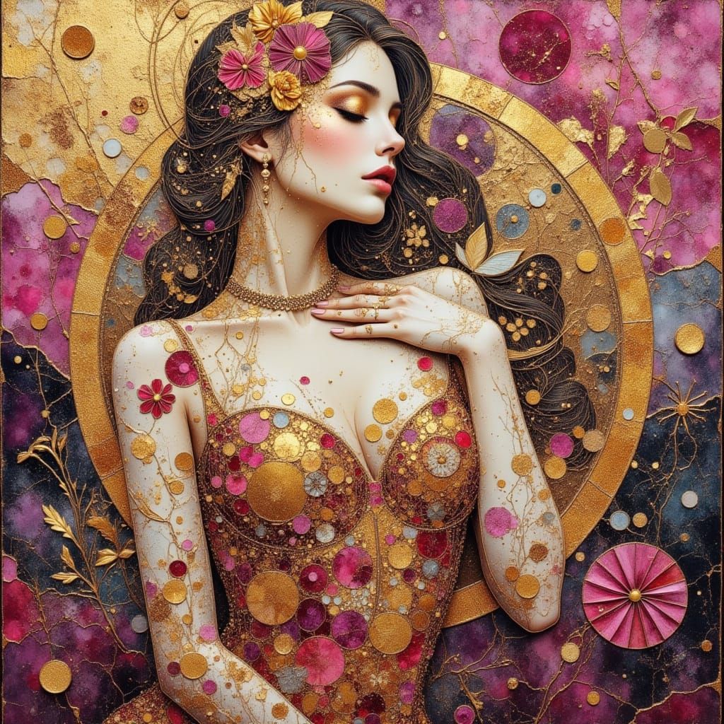 A vibrant mixed media collage of a woman with art deco architecture. The surreal image features metallic accents, a mosaic effect, and a color palette of magenta, gold, and silver inks.