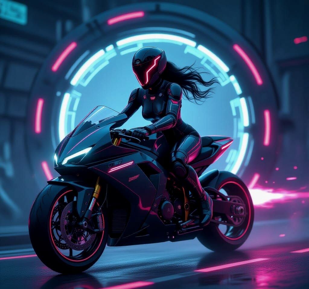 A futuristic robot emerges from a cybernetic portal on a neon-lit motorcycle. This image shows a high-tech scene with a holographic shield, rendered in a cyberpunk aesthetic.