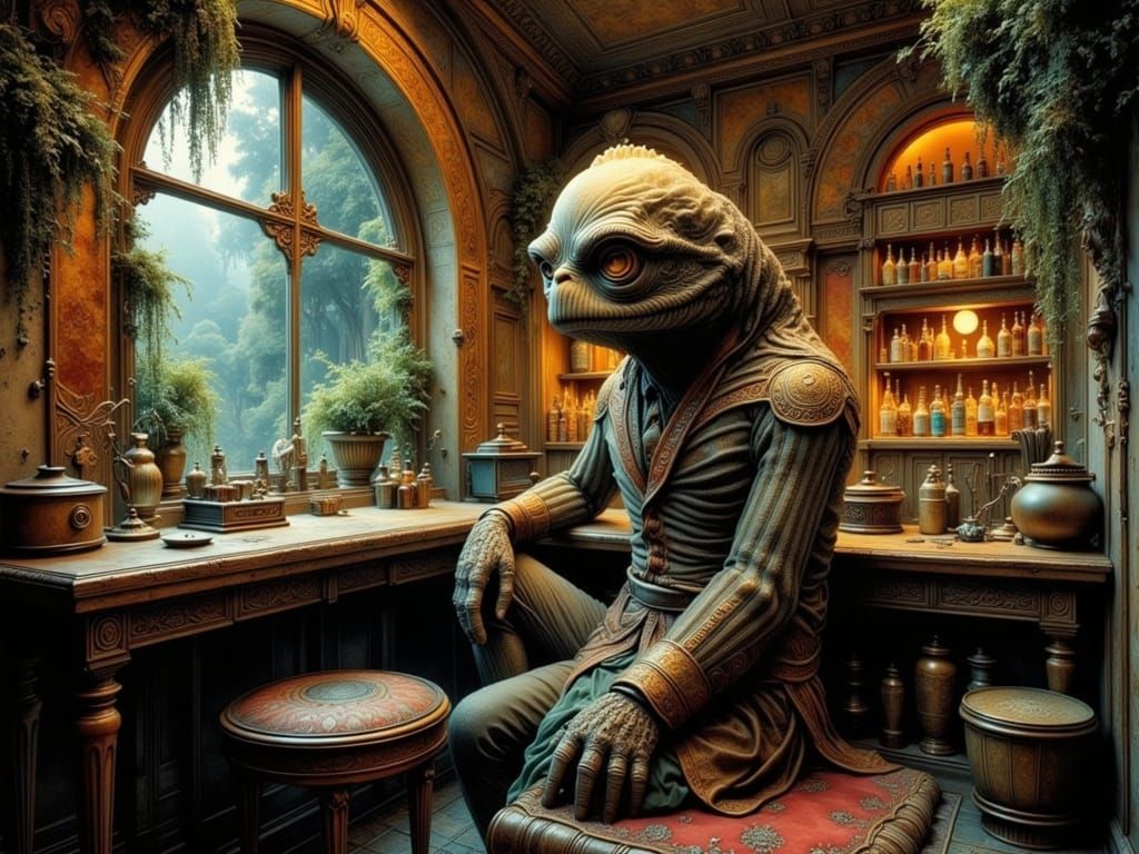 This high-resolution image features a detailed, high-contrast scene set in a multicultural alien cyber bar, rendered in a folkloric lomography aesthetic with intricate textures and sharp focus.