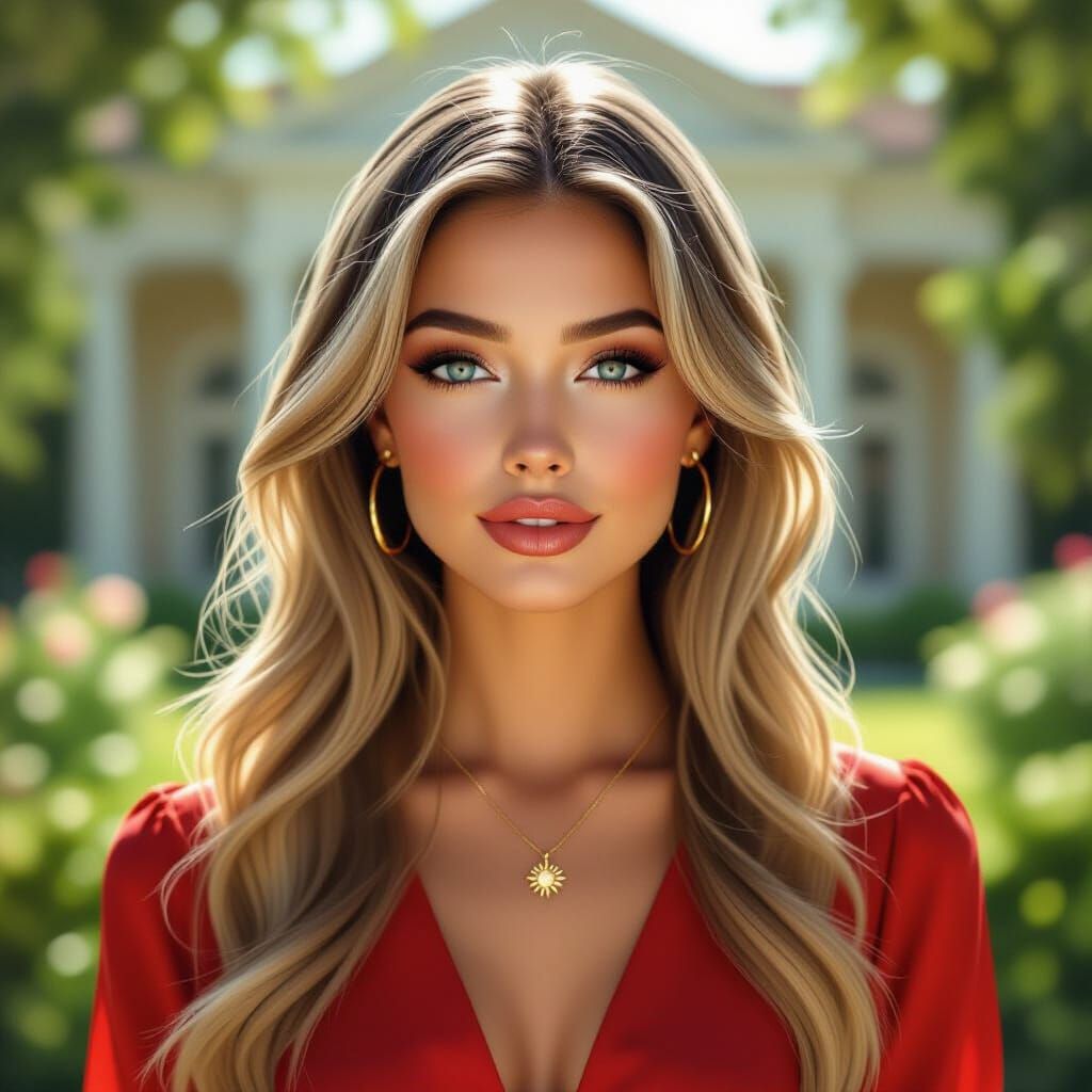 A hyperrealistic digital painting of a beautiful woman with straight blonde hair, blue eyes, and a red blouse, set in a sunlit mansion garden. Inspired by Sargent's portraiture and de Lempicka's vibrant colors.