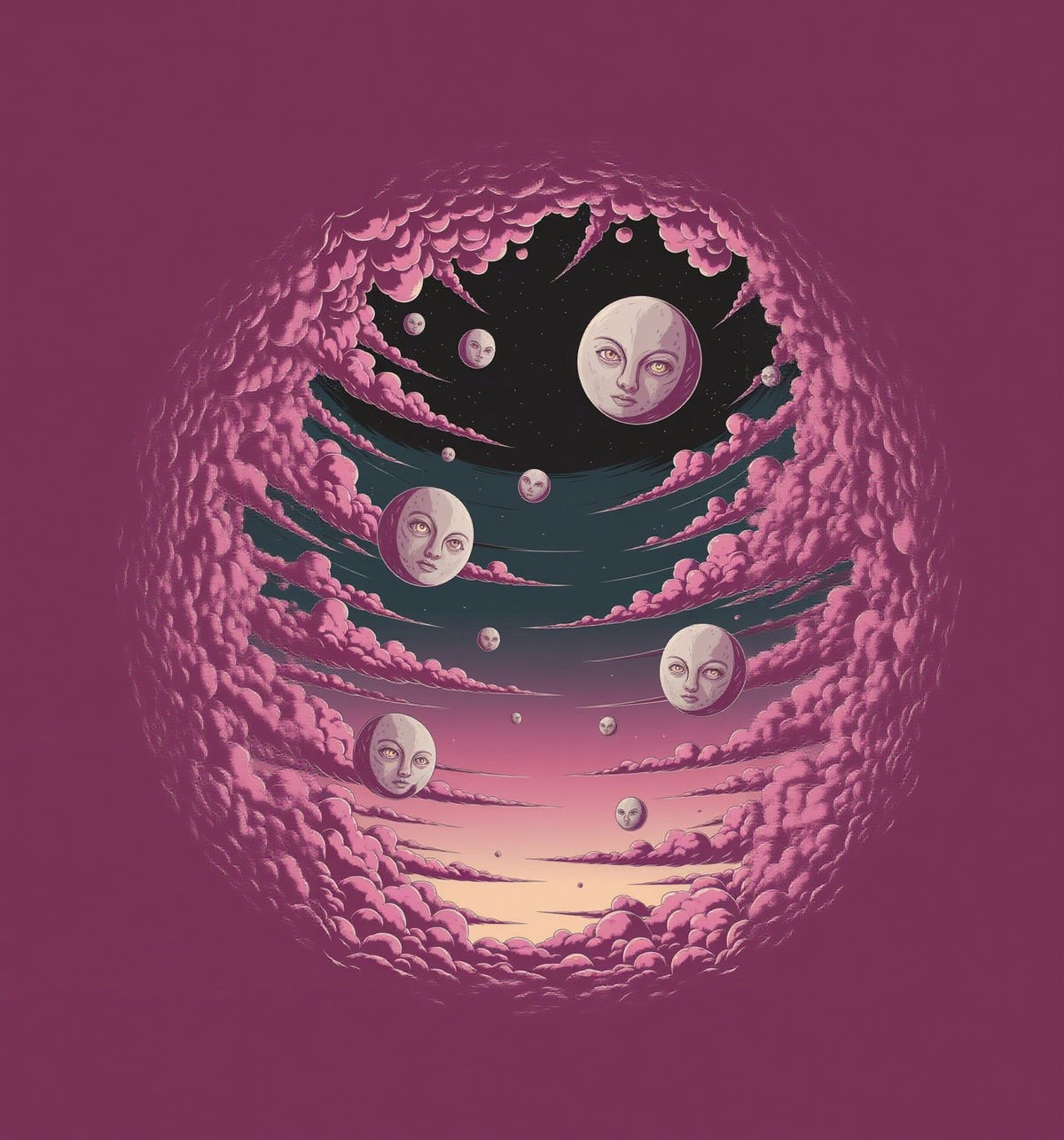This image shows a surreal dreamscape sky filled with impossible colors and eerie phenomena. The sky, rendered in a dreamcore aesthetic, features multiple moons with eyes and abstract cloud formations.