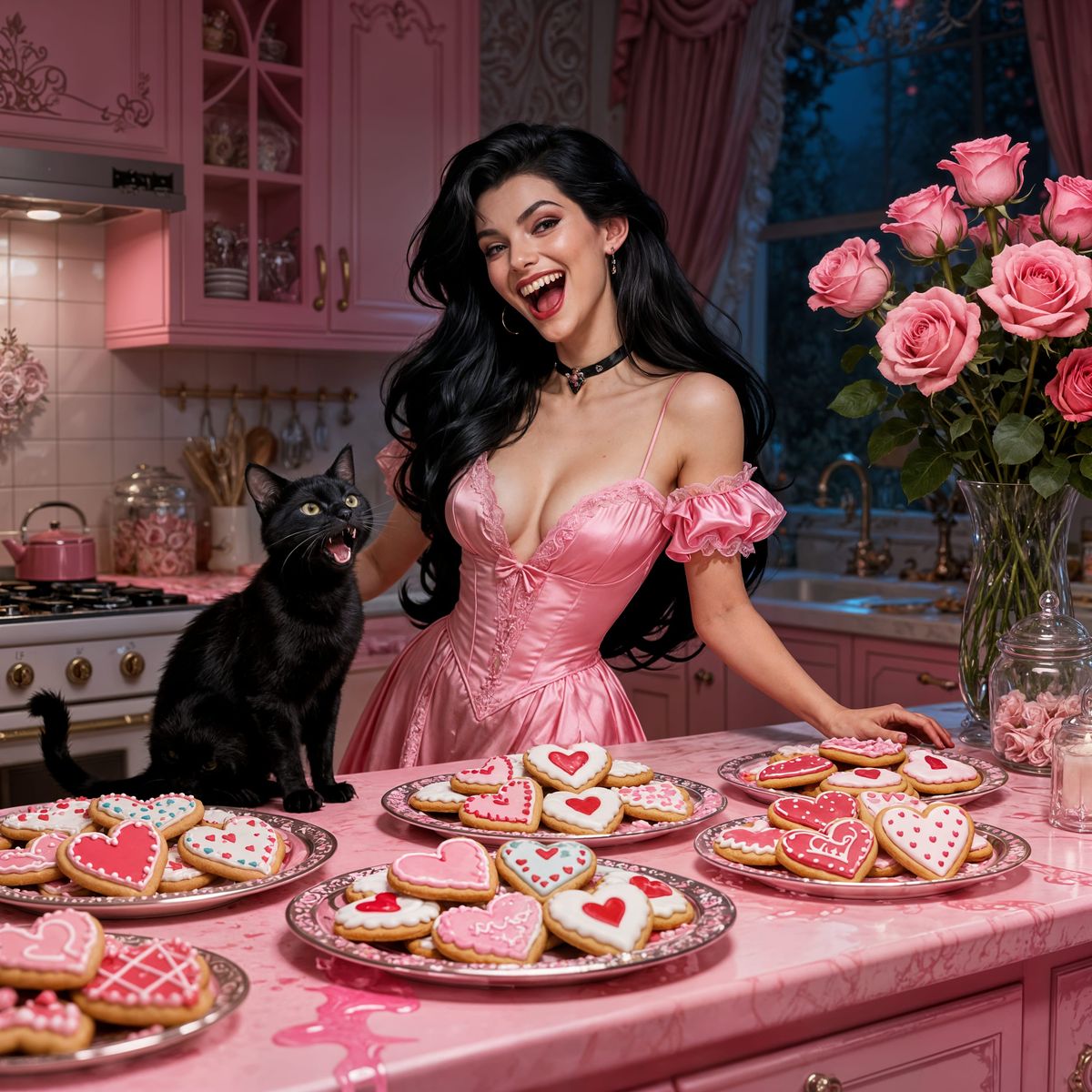 A woman in a pink dress laughs with a black cat beside Valentine's Day cookies and pink roses. Detailed fantasy concept art in deep, complementary colors.