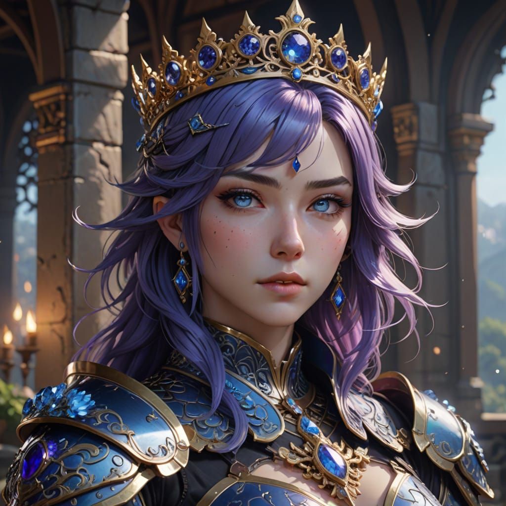 This 3D anime art features a young queen in detailed medieval armor, wearing an ornate crown with sapphires. Her violet hair frames her pale face in this stunning, ultra-detailed fantasy portrait.
