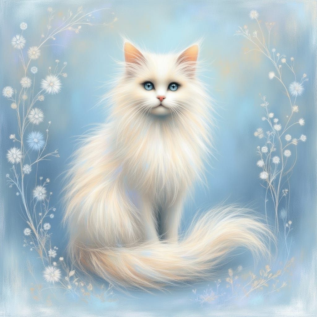 This image features a serene, long-haired Persian cat with meticulously brushed white fur. It sits against a soft pastel blue backdrop with tiny floral details, rendered in a dreamy digital painting style.