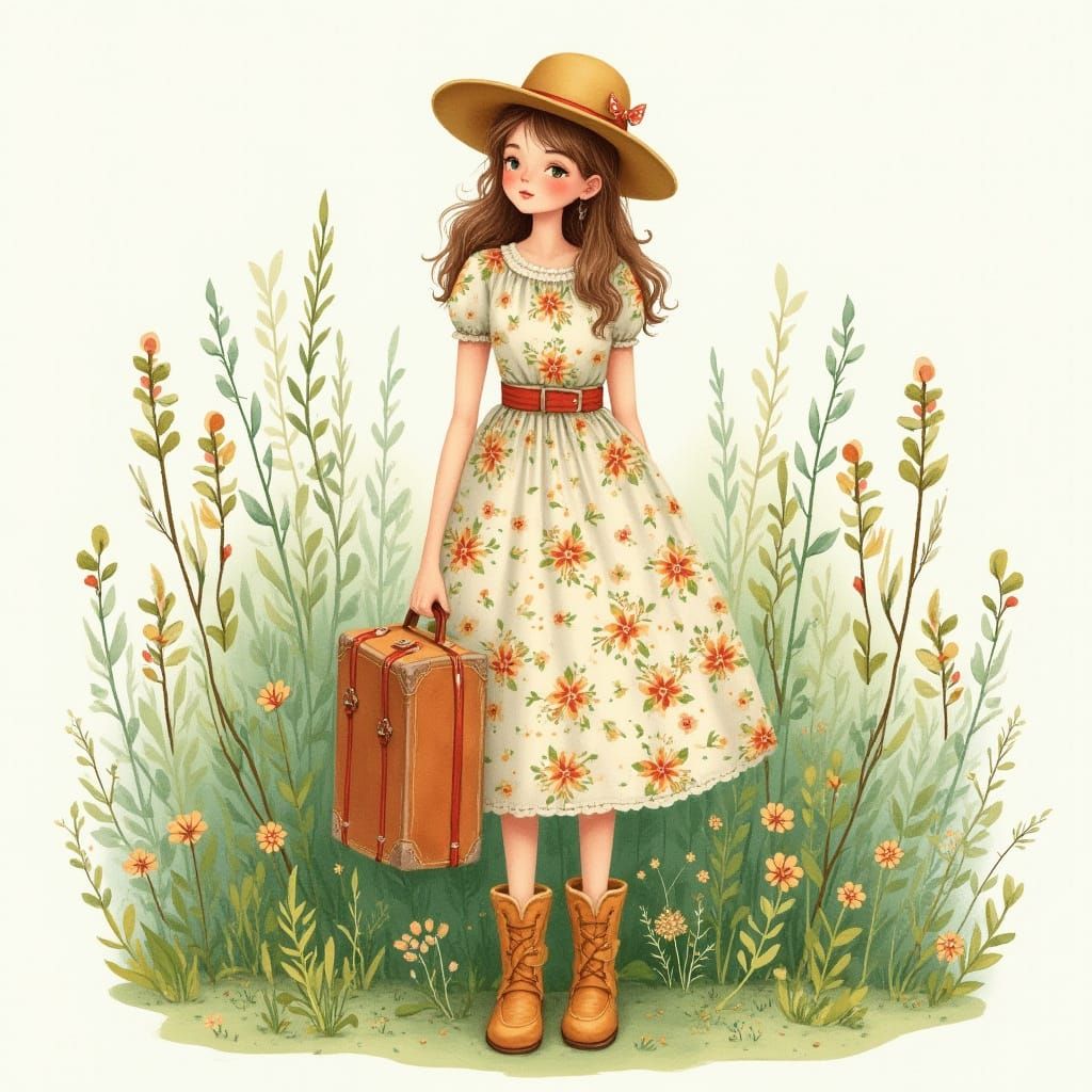 A charming image of a woman in a floral dress with a suitcase, amidst lush greenery. The artwork evokes a whimsical, watercolor aesthetic with soft brushstrokes and a delicate color palette.