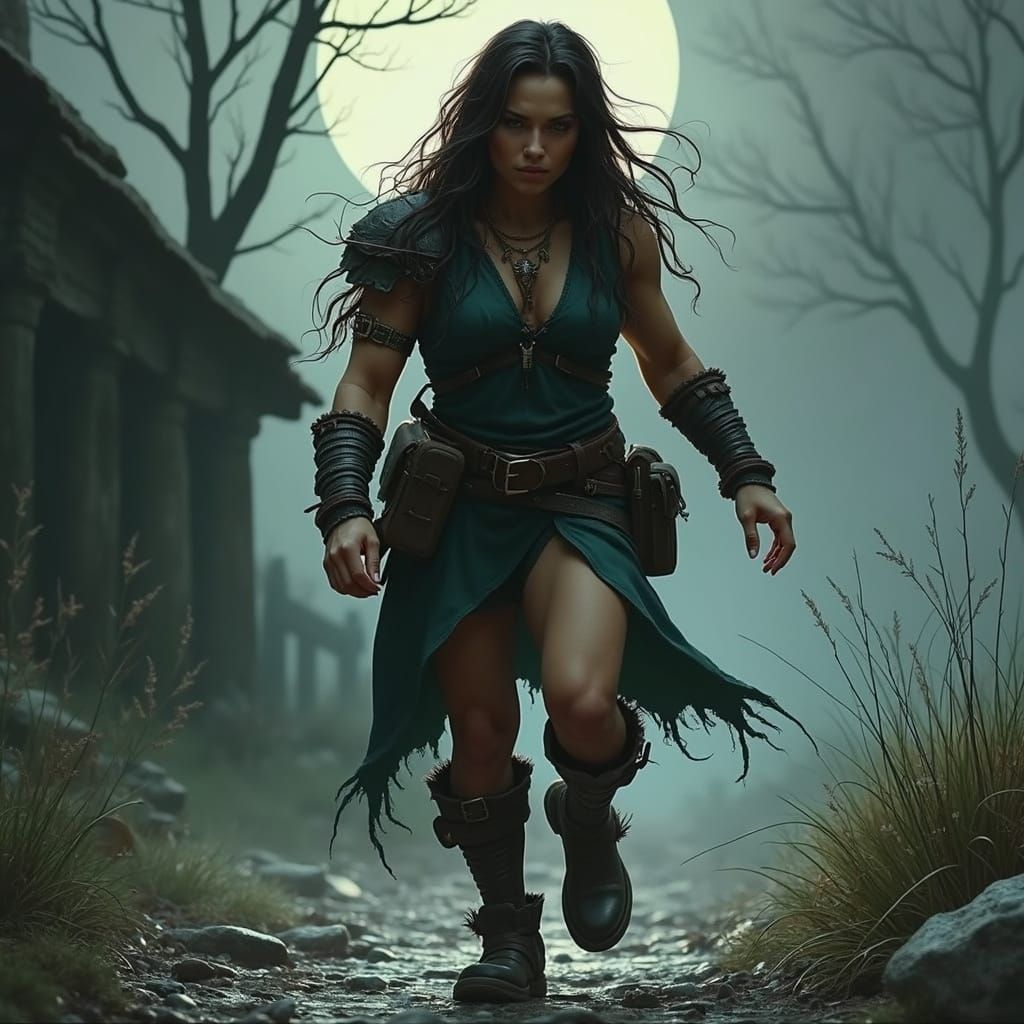 This image depicts a robust female dwarf illuminated by pale moonlight, with intricate details and a colorful background, showcasing a dramatic and hyperrealistic artistic style