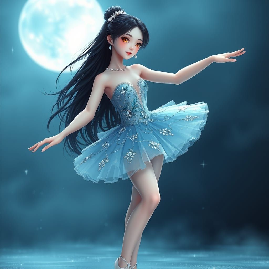 A delicate ballerina in a shimmering blue pearl tutu poses en pointe on a misty, moonlit stage, surrounded by intricate details and ethereal textures blending traditional Japanese elegance with modern concept art.