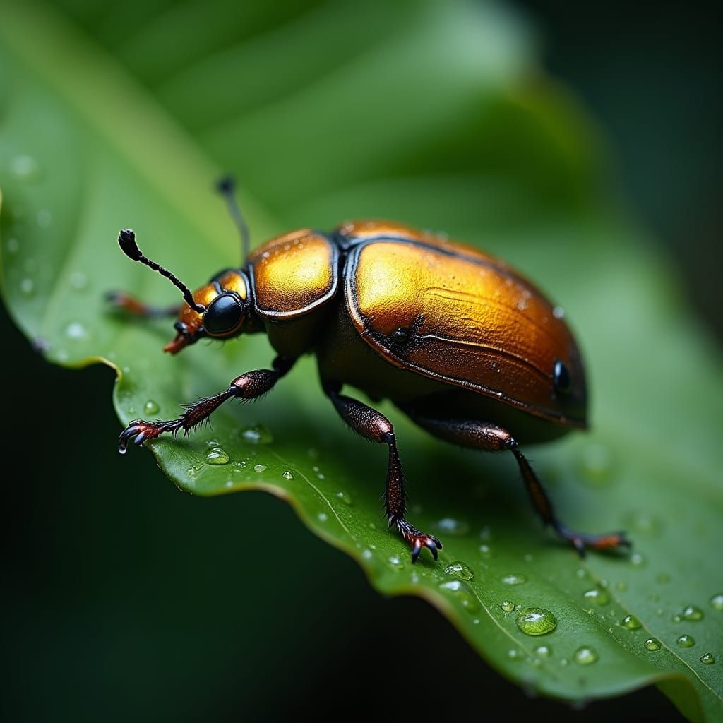 This image showcases a rare Chrysina aurigans beetle on a dewy emerald-green leaf, surrounded by dappled rainforest light, with intricate details and cinematic flair reminiscent of National Geographic's macro photography.