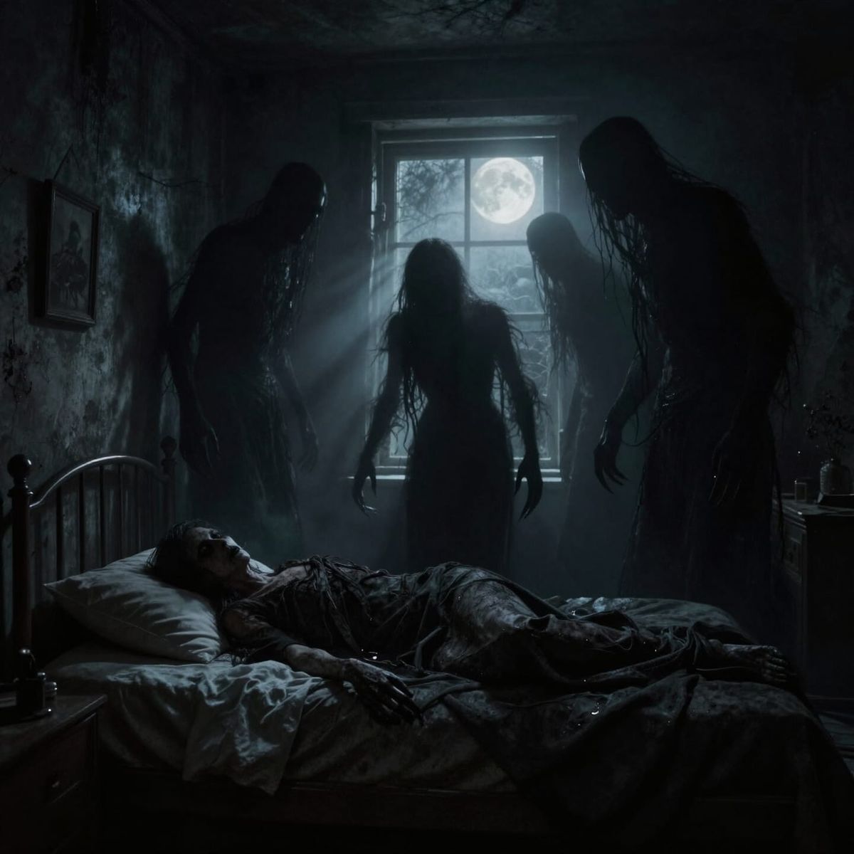 This image depicts a hyperrealistic and terrifying scene of sleep paralysis. Ethereal shadow figures with distinct silhouettes stand ominously over a bed in a dark room, creating intense psychological horror.