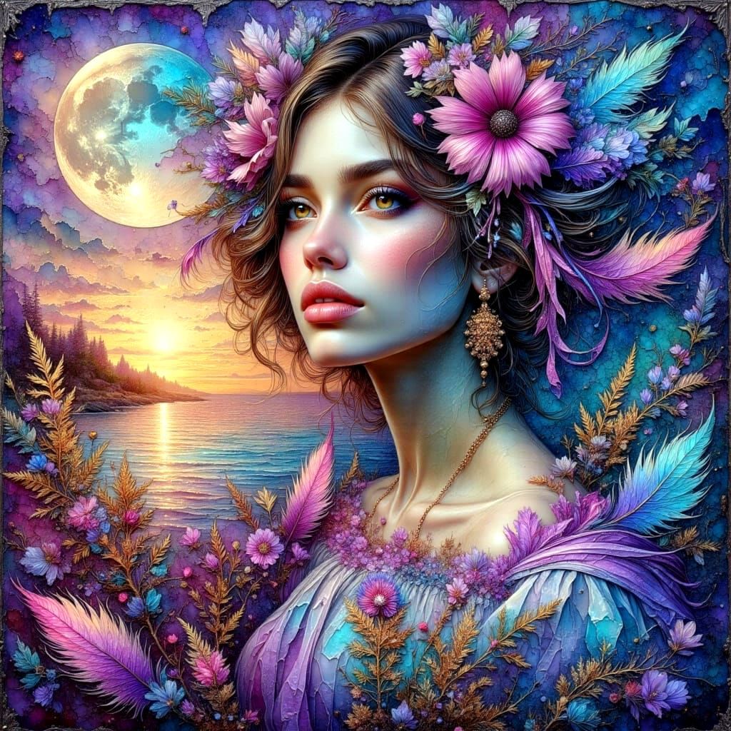 A close-up watercolor portrait with vibrant colors, featuring feathers and ferns under a cosmic night sky with a full moon. Rendered with impasto and textured brushstrokes.