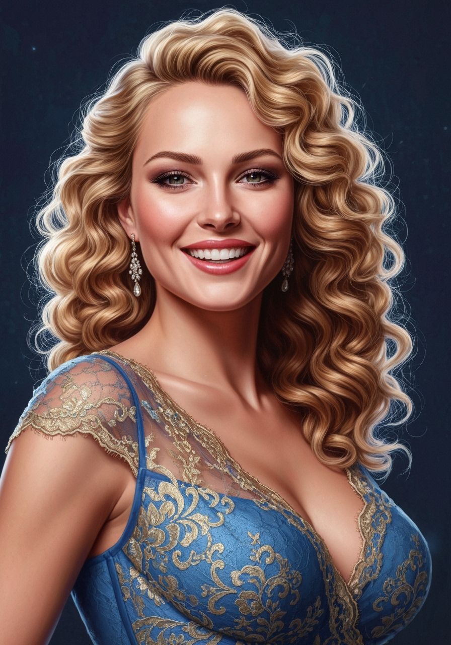 A portrait of a smiling woman with long blonde hair in an ornate blue and gold lace gown. The image features realistic detail and vibrant colors.