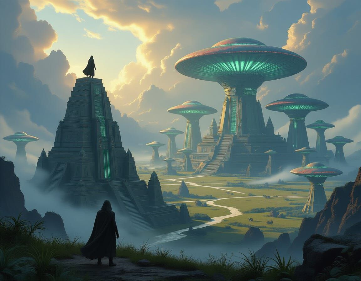 A digital painting of a lone figure on an Art Deco ziggurat surveying a savanna with glowing mushroom palaces. The fantasy landscape evokes wonder with dynamic lighting and intricate details in a maximalist style.