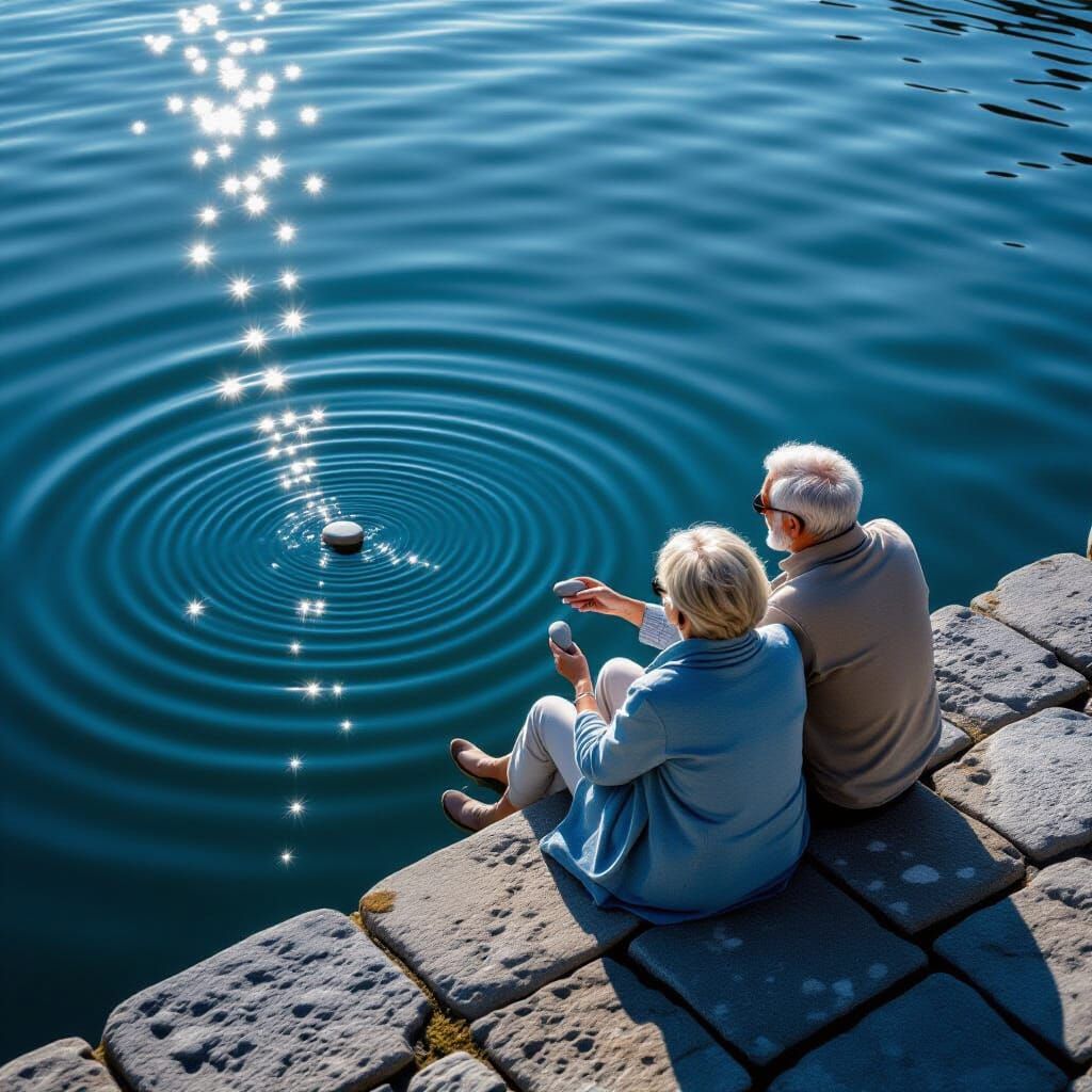 A tranquil image of an elderly couple on a wharf, tossing stones into glowing water. This artwork evokes impressionistic and luminist styles to capture a peaceful, dreamlike scene.