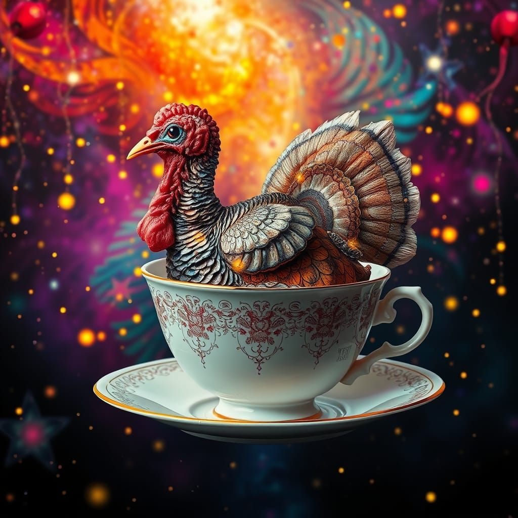 This image depicts a whimsical wild turkey Thanksgiving angel as a boat sailing in a vibrant galaxy. It features a blend of collage and photography, with intricate details and dramatic lighting.