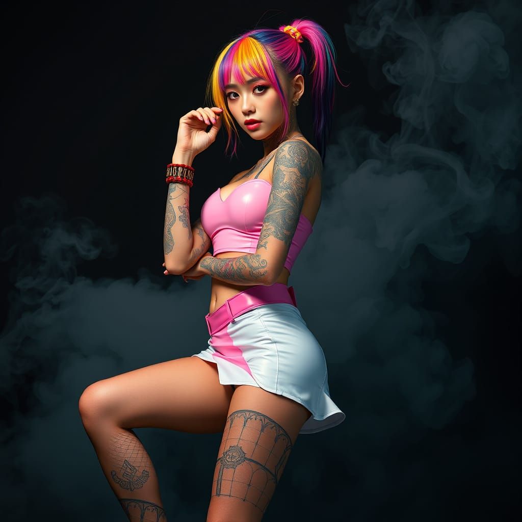A striking image of a slender Japanese woman with colorful hair and tattoos, wearing a pastel PVC and latex outfit. The lowbrow art style features a moody backdrop of dark smoke.