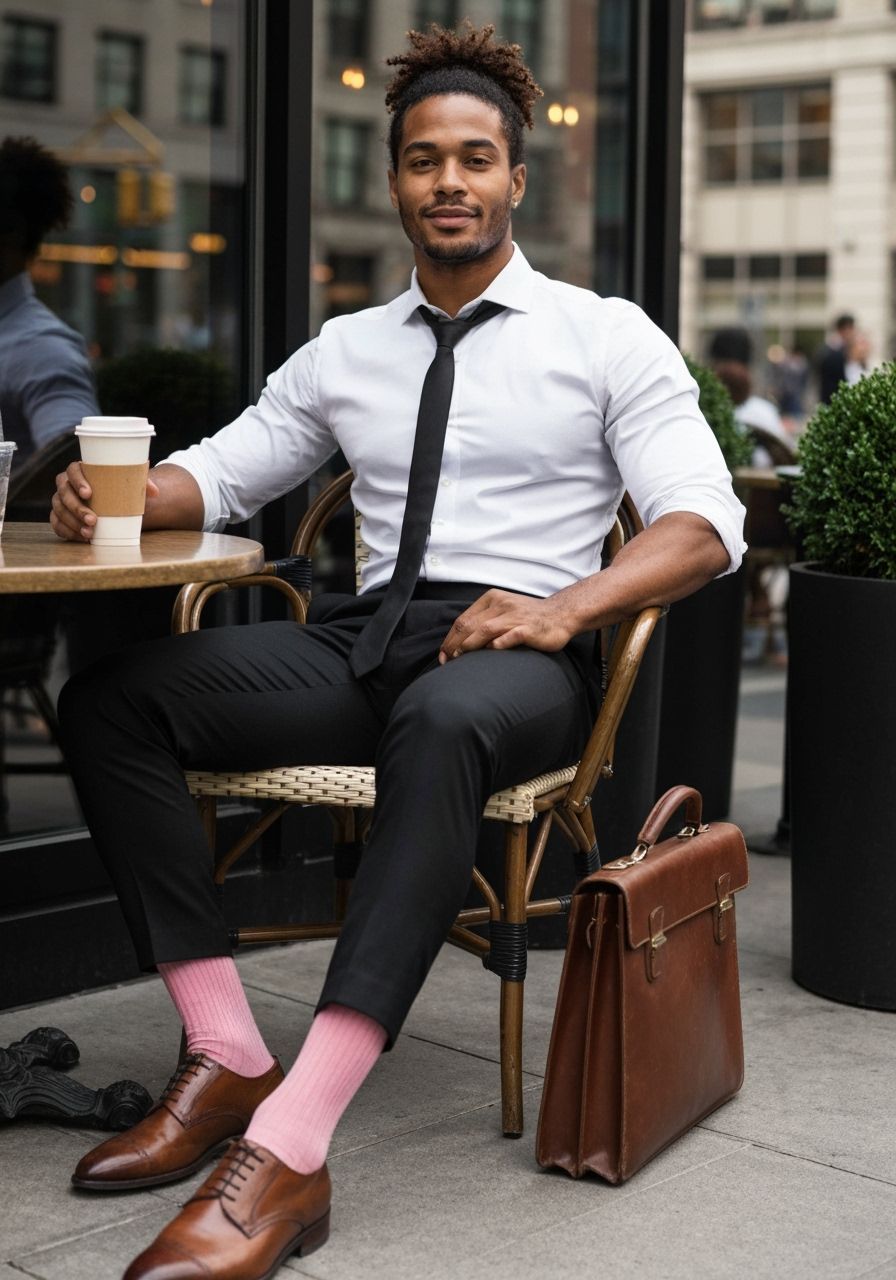 A handsome Afro-Caribbean man enjoys coffee on a New York City cafe terrace. Soft morning light highlights his athletic build in a slim white shirt and black tie, creating a stylish and relaxed portrait.