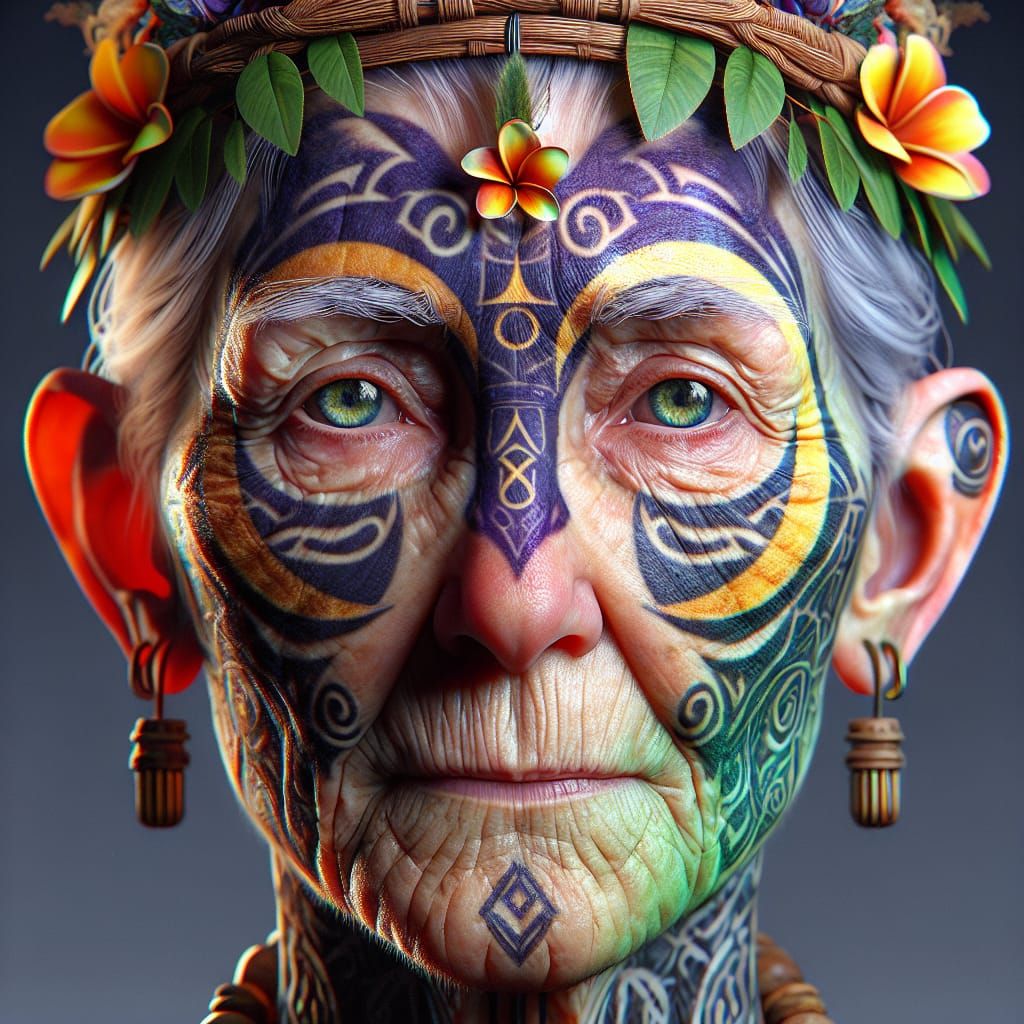 This image shows a photorealistic portrait of an elderly Celtic druid with tribal tattoos and a lei crown. The portrait, rendered in vivid colors, blends Celtic tradition with lunarpunk aesthetics.