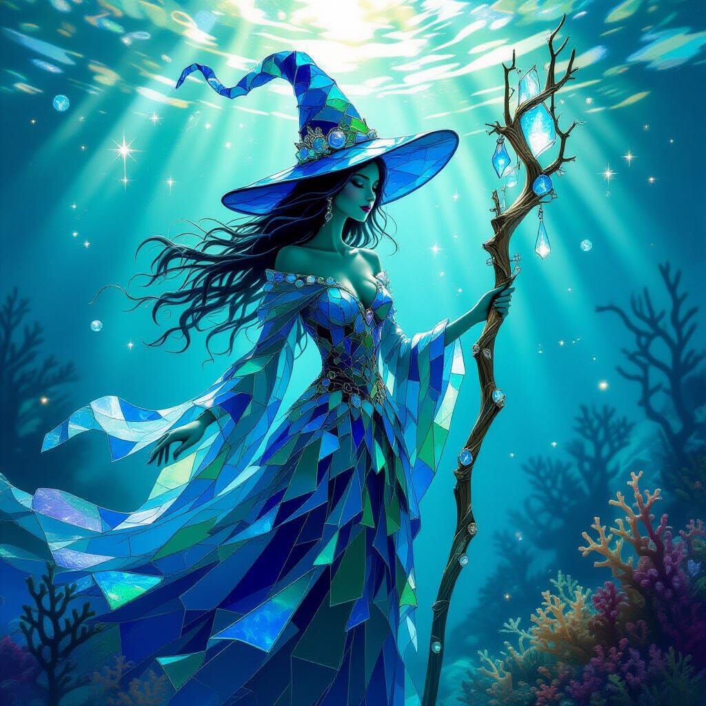 A magical witch sculpted from iridescent sea glass, wearing robes of blue and green shards. This illustrative artwork features a bioluminescent underwater scene with swirling currents and painterly textures.