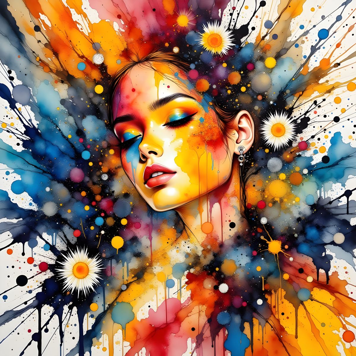 This image features a dynamic abstract composition with vibrant ink splatters and fluid lines, reminiscent of action painting techniques.