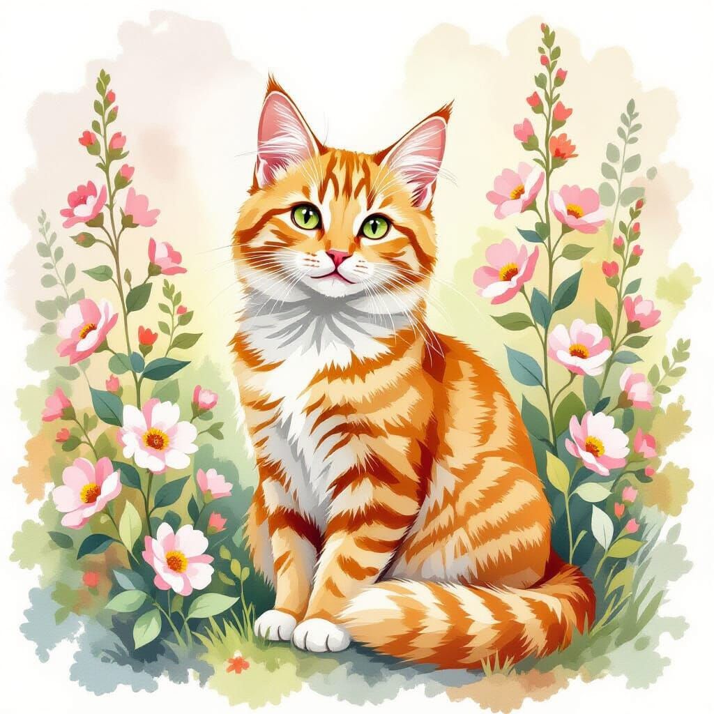 A charming watercolor illustration of an orange and white tabby cat sitting among flowers. The image uses delicate brushstrokes and gouache textures in a whimsical style.