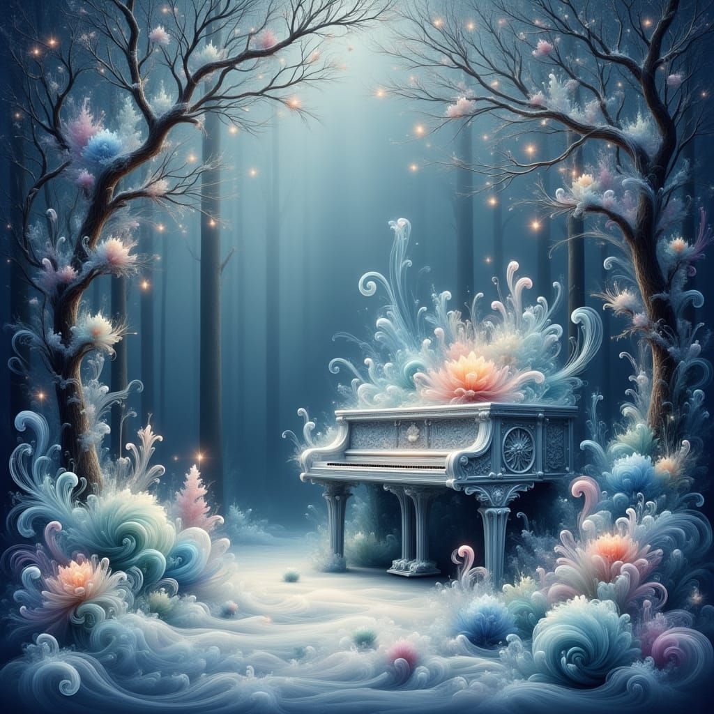 This image shows a magical piano set within a beautiful, otherworldly winter forest, evoking a sense of enchantment and wonder.